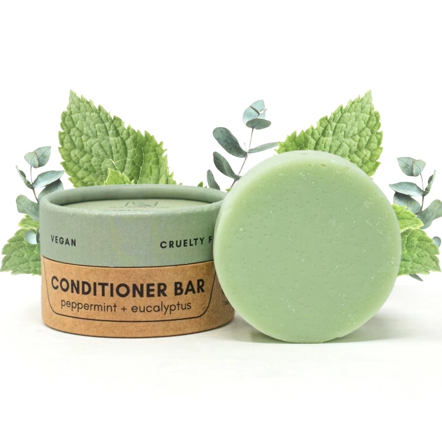 -Our Peppermint + Eucalyptus Conditioner Bar is designed for those seeking deep nourishment, detangling, and an invigorating, refreshing scent without any plastic waste. This bar combines the crisp, cooling aroma of peppermint with the herbal, uplifting essence of eucalyptus, creating a revitalizing fragrance that awakens the senses and soothes the scalp.