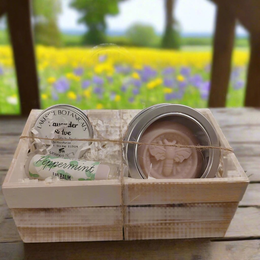 Give the gift of natural care with this beautiful set featuring a moisturizing lotion bar, an all-natural lip balm, and a calming lavender salve. Each item is handcrafted with natural and organic ingredients, simple, pure, and free from harsh chemicals and packaged in an adorable gift box.
