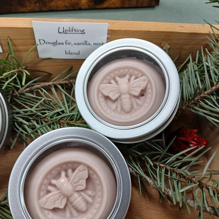 Uplifting Vanilla Mint: Shea butter, coconut oil, jojoba oil beeswax, and a blend of 100% pure essential oils copaiba (Copaifera langsdorffii), fir-douglas (Pseudotsuga menziesii), fir-balsam (Abies balsamea), balm mint bush (Prostanthera melissifolia), cedarwood-himalyan (Cedrus deodara), peppermint (Mentha piperita), laurel leaf (Laurus nobilis), fir balsam absolute (Abies balsamea), damiana (Turnera diffusa), vanilla CO2 (Vanilla planifolia), spearmint (Mentha spicata)